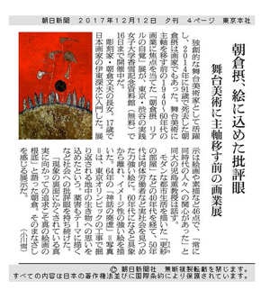 朝倉摂「リアルの自覚」展評(2017.12.18) 2017 12/17 お知らせ 作家 実践女子大学香雪記念資料館で開催された展覧会「リアルの自覚」の展評が、朝日新聞に掲載されました。ぜひご高覧下さい。 お知らせ 作家 URLをコピーしました! 朝倉摂「リアルの自覚」展評(2017.12.11) 企画展「レイヤーズ・オブ・ネイチャー その線を越えて」