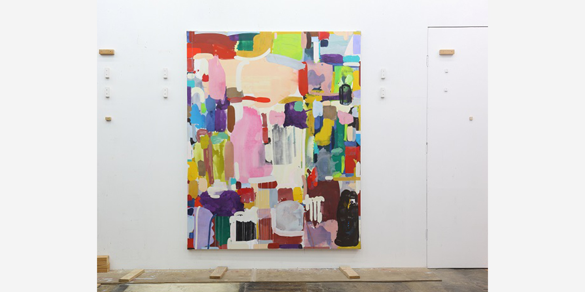 カゼインテンペラを主として、色鉛筆やクレヨン、コラージュ等による鮮やかな抽象画。